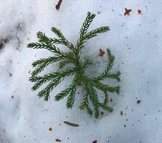 Today, I noticed all the green even in this winter landscape — moss and lichen and a fern sticking out from the snow, pine and hemlock and ground pines, the glossy leafed mountain laurel.